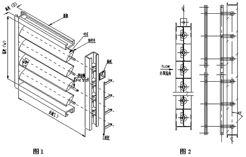 结构设计 采用薄板冲压整体焊接结构,由外部框架、挡板叶片、密封片、前后轴承、连动系统及驱动器六部分组成(见图1)。框架与挡板均具有足够的弹性与刚度。沿框架内侧四周及挡板中间镶有0.6~1㎜厚的弹性密封片,受风门两侧气流的压差密封。挡板前轴承采用调心轴承并具有自动润滑作用。各挡板轴穿出框架后有连接件连接,并由其中一根驱动连接驱动装置作90℃方位的全开与全闭转动(见图2)。框架翼面与烟风道接口框架或法兰面接触后四周焊接,小截面风门亦可用螺栓连接。 |